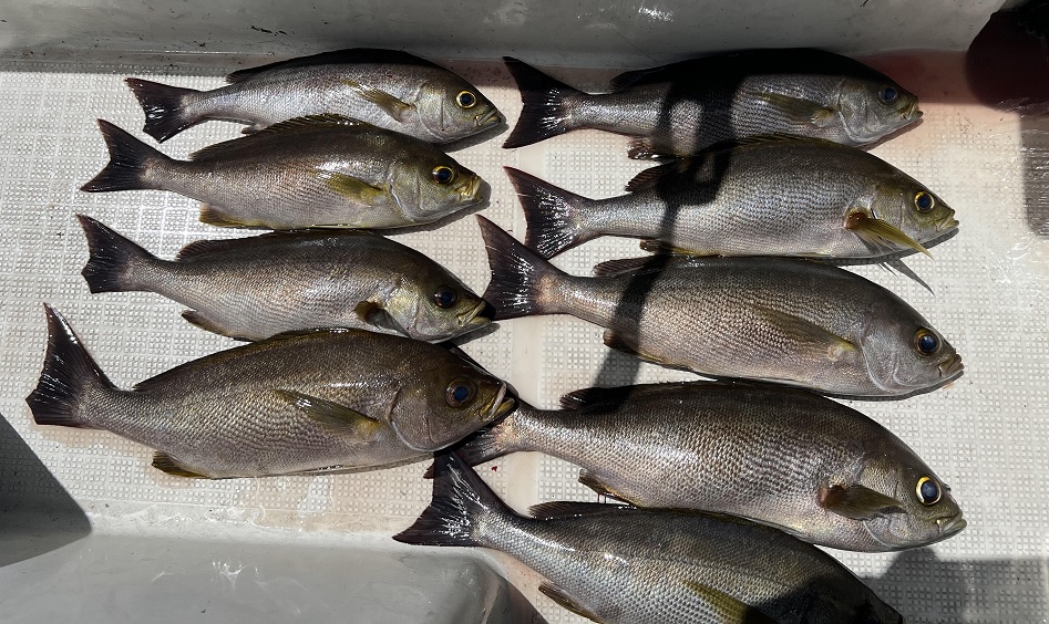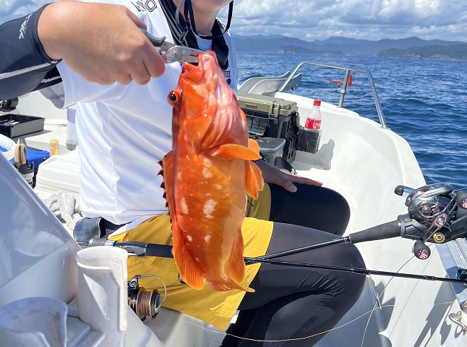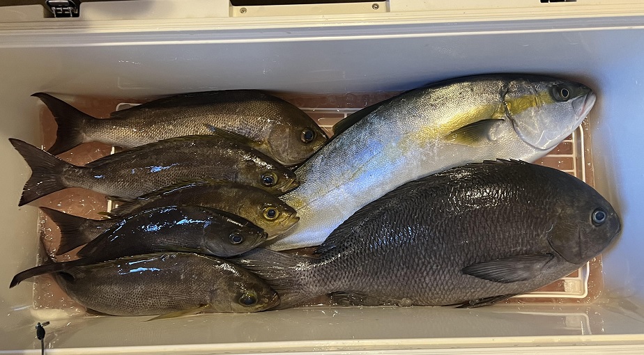 ライトジギングでは、ナイスサイズのアカハタ。その他、ハマチ、メジナと美味しい魚をキープして納竿です。