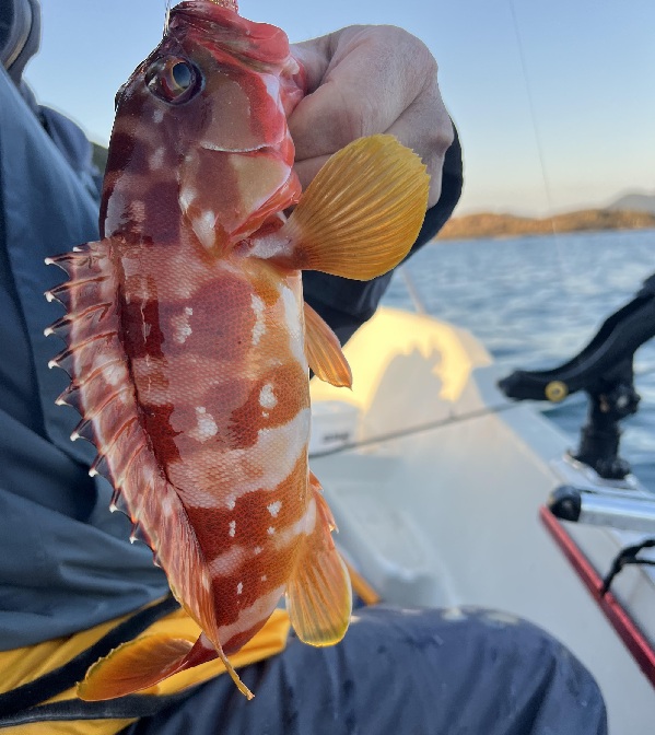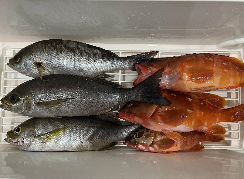 潮が動かなくなった時点で、再度移動。ロックフィッシュ、カワハギなどを再度狙いますが、アカハタを少し追加して納竿です。